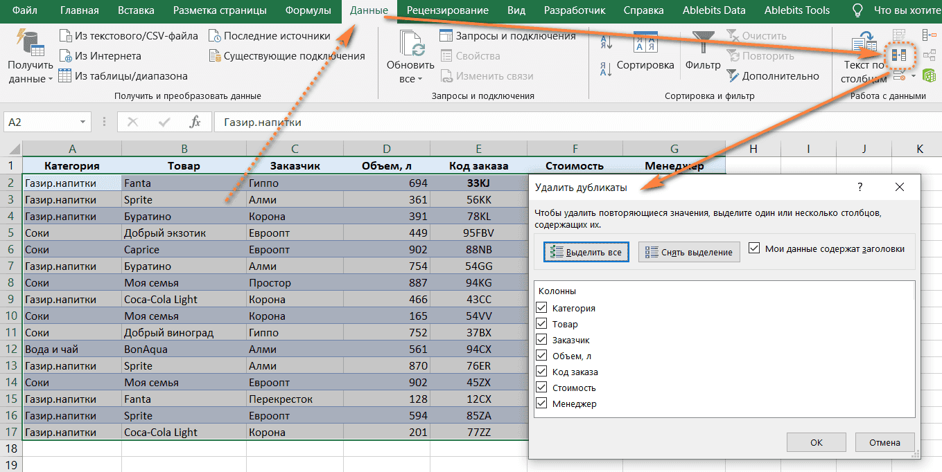 Необходимо не только найти повторяющиеся значения в Excel, но и удалить их. Как убрать дубликаты из таблицы максимально быстро и просто?