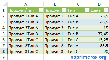 С помощью этой формулы мы объединяем значения столбцов «Продукт» и «Тип». Заполните все ячейки.