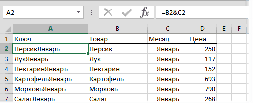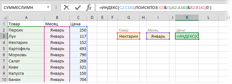 Функция ИНДЕКС возвращает содержимое ячейки N в порядке ценового диапазона C2:C161. В этом случае функция ПОИСКПОЗ находит порядковый номер нужной ячейки. Ищет связь между названием продукта и месяцем (NectarineJanuary) по очереди во всех ячейках диапазона A2:A161 и B2:B161, вставленных из двух столбцов, и предоставляет порядковый номер ячейки, в которой было найдено точное совпадение. По сути, это первый способ, но ключевой столбец создается практически внутри формулы, а не в ячейках листа.