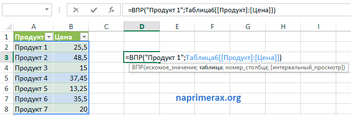 или даже =ВПР(«Товар 1»;Таблица6;2).