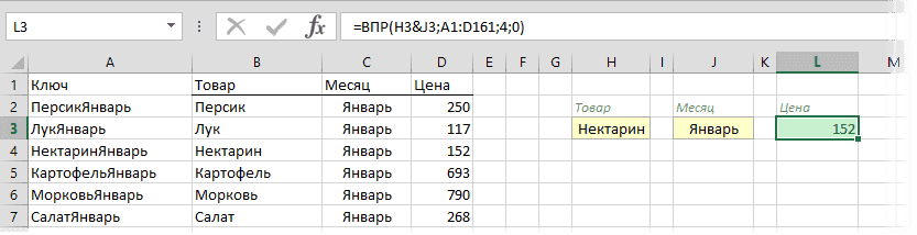 Теперь вы можете использовать знакомую функцию ВПР, чтобы найти вставленную пару NectarineJanuary из ячеек H3 и J3 в сгенерированном ключевом столбце: