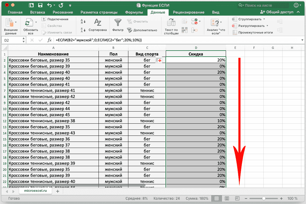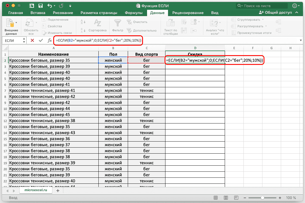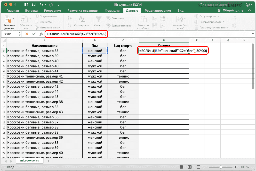 В качестве примера возьмем нашу таблицу. Теперь скидка в 30% будет предоставляться только в том случае, если это женская обувь, предназначенная для бега. Если эти условия выполняются одновременно, значение ячейки будет равно 30%, в противном случае оно будет равно 0.