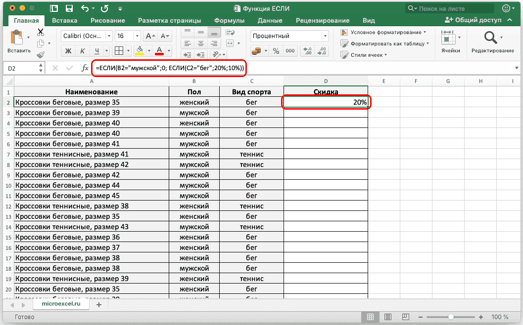 = IF(B2=»мужчина»;0; IF(C2=»бег»;20%;10%))