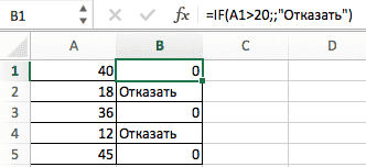 - В следующем примере формула имеет вид =IF(A1>20; «Запретить») или =If(A1>20; «Запретить»), где аргумент value_if_true не указан, формула будет возвращать «0» всякий раз, когда условие равно TRUE.