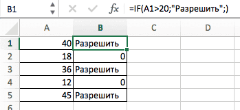 В примере ниже формула =IF(A1>20, «Разрешить») или =If(A1>20; «Разрешить»), где value_if_false не указано, но аргумент value_if_true по-прежнему следует через запятую. Функция возвращает «0» всякий раз, когда проверяемое условие не соответствует условию TRUE.
