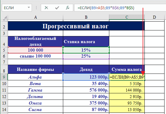 Процентная ставка прогрессивного налога зависит от дохода. Если доход компании превышает определенную сумму, ставка налога выше. Используя функцию IF, рассчитайте сумму налога.
