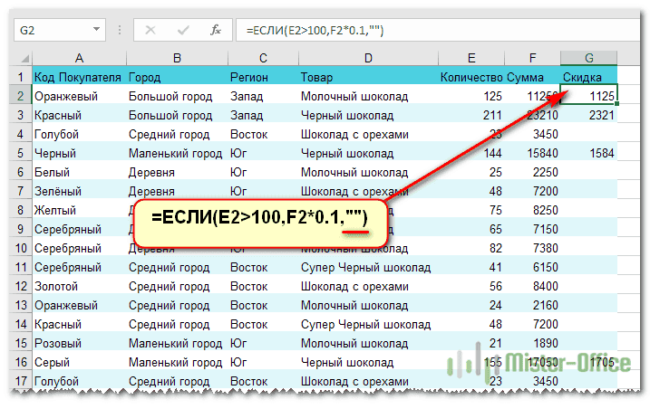 =ЕСЛИ(E2>100,F2*0.1,””)