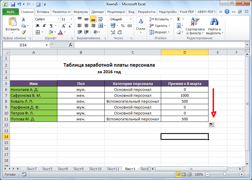 - Затем нажмите клавишу Enter. Теперь, чтобы формула появилась в нижних ячейках, просто наведите курсор на правый нижний угол заполненной ячейки, нажмите левую кнопку мыши и, не отпуская ее, переместите курсор в нижнюю часть таблицы.