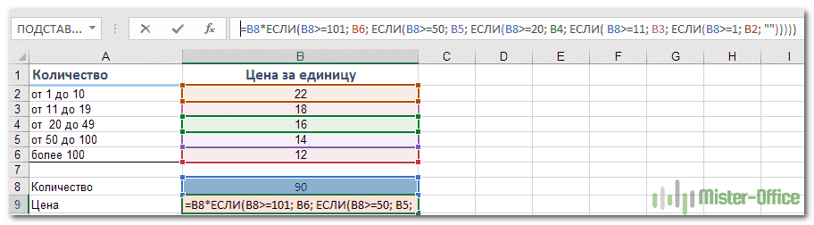 =B8*IF(B8>=101; 12; IF(B8>=50; 14; IF(B8>=20; 16; IF( B8>=11; 18; IF(B8>=1; 22; «»)))))