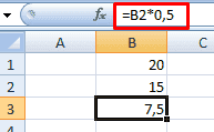 Оператор умножил значение в ячейке B2 на 0,5. Чтобы ввести ссылку на ячейку в формулу, просто нажмите на эту ячейку.
