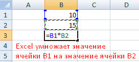 - Щелкнули по ячейке В2 — Excel ее «обозначил» (в формуле появилось название ячейки, вокруг ячейки образовался «мигающий» прямоугольник).