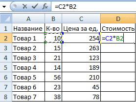 - Помните из математики: чтобы найти стоимость нескольких единиц продукта, вы умножаете цену 1 единицы на количество. Для расчета стоимости введите в ячейку D2 формулу: = цена за единицу * количество. Константы формулы — это ссылки на ячейки с соответствующими значениями.