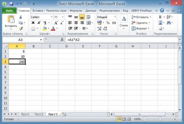 Для начала нужно навести курсор на ячейку А3 и нажать левую кнопку мыши. На клавиатуре нажмите клавишу =. Наведите курсор на ячейку A1 и нажмите левую кнопку мыши. Затем на клавиатуре нажмите знак умножения в Excel*, расположенный с левой стороны клавиатуры или под цифрой 8. Чтобы отобразить знак умножения в Excel*, расположенный под цифрой 8, нужно сначала нажать кнопку Shift на клавиатуре и, удерживая ее, нажмите *, расположенную под цифрой 8. Затем поместите курсор на ячейку A2 и нажмите левую кнопку мыши. В конце нажмите клавишу Enter на клавиатуре и сразу же отобразится результат.