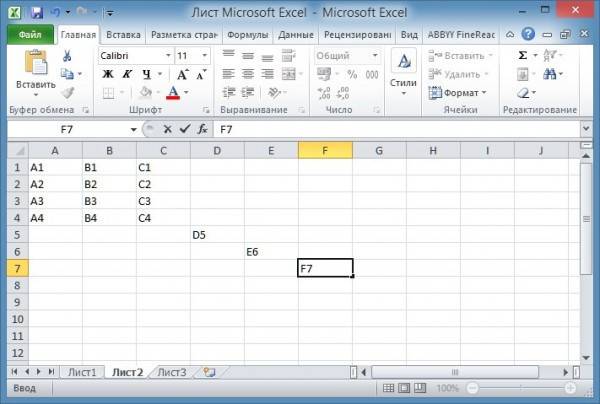 - Весь лист разбит на ячейки, и к каждой ячейке можно получить доступ по адресу. Обычно адрес ячейки выглядит так «А1», «В7». Эти адреса означают, что ячейка находится либо в столбце A и строке 1, либо в столбце B и строке 7.
