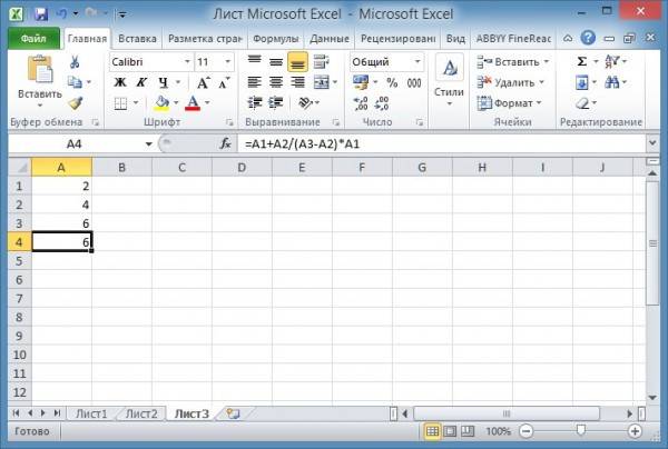 Вам нужно писать сложные формулы в Excel так же, как и в математике. Например, у вас есть ячейки, заполненные данными, и вам нужно отобразить результат в ячейке A4 по формуле =A1+A2/(A3-A2)*A1.