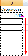 Находим маркер автозаполнения в правом нижнем углу первой ячейки столбца. Нажмите на эту точку левой кнопкой мыши, удерживайте ее и перетащите вниз по столбцу.