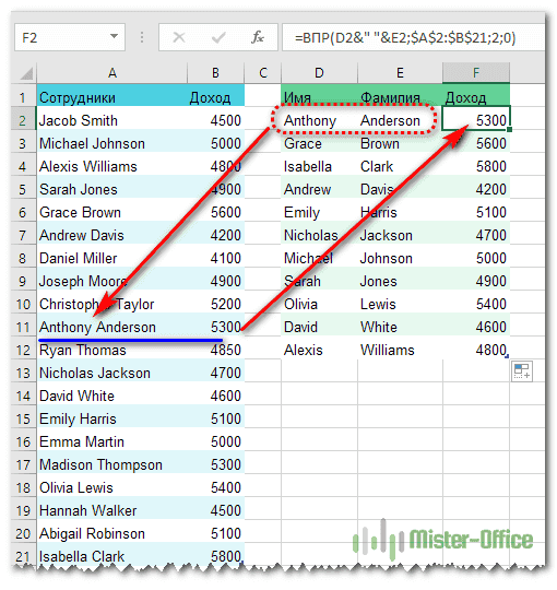 Затем в таблице доходов ищем ячейку с именем и фамилией, разделенными пробелом.