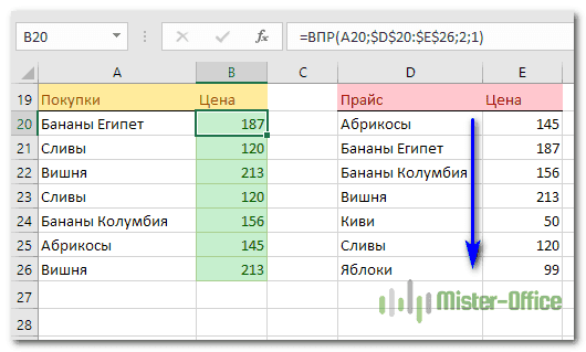 Поиск цен на египетские бананы оказался на первой позиции, а на второй зафиксированы сливы. И это слово по правилам алфавита ниже, чем «бананы Египта». Поэтому нет необходимости искать дальше. У нас 145. И неважно, что это цена абрикосов. Поиск цены на сливы продолжался до тех пор, пока D15 не наткнулся на слово, расположенное ниже по алфавиту: яблоки. Останавливаемся и берем цену предыдущей линии.