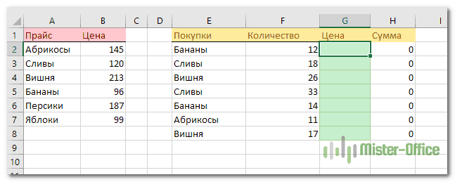 Наш прайс-лист находится в столбцах A и B. Список покупок находится в EH. Допустим, первым пунктом в списке покупок являются бананы. Нам нужно найти этот товар в столбце А, где указаны все наименования, затем поставить его цену в ячейку G2.
