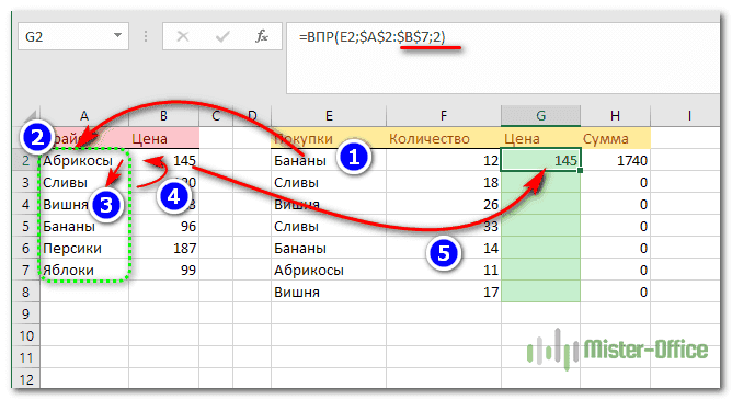 Как и в предыдущих примерах, наша задача — найти цену для каждого товара, извлекая его из прайс-листа. Если область поиска (Цена) является крайним левым столбцом в области поиска, для точного совпадения вставляется обычная формула ВПР: