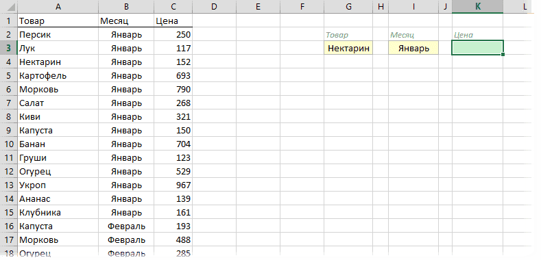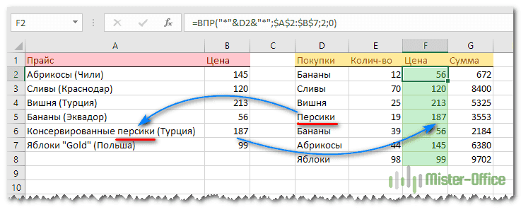 Конструкция «*»&D2&»*» означает, что к содержимому ячейки D2 с обеих сторон добавляются звездочки *. То есть ищем любое вхождение этого слова; до и после могут быть другие слова и символы. Как, например, это произошло с продуктом «персики». В нашем случае первый параметр будет иметь вид «*персики*». При поиске такого дизайна «Консервированные персики (Турция)» будут определены как приемлемый вариант)».
