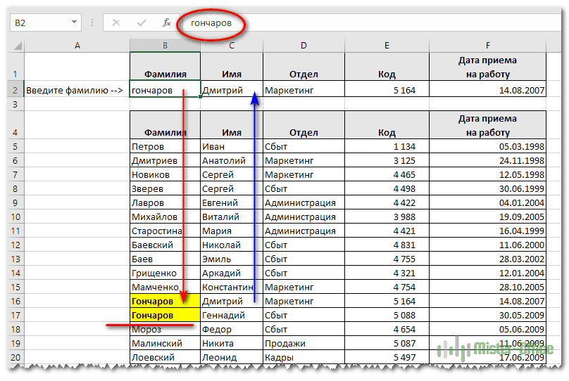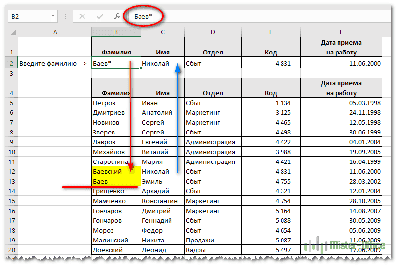 Как и в примерах выше, при вводе фамилии выполняется точный поиск. Но есть некоторые вещи, о которых мы не упомянули ранее.