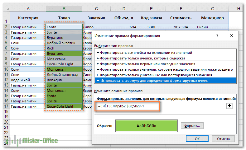 - Работает только для одиночных ячеек. Чтобы отметить повторяющиеся строки, вы должны создать свои собственные правила.