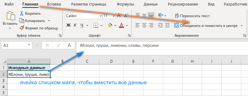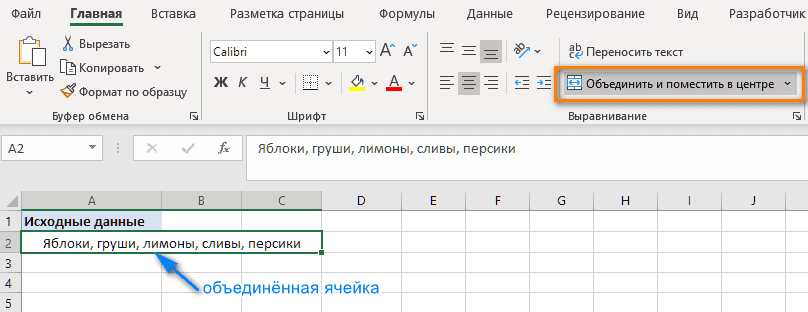 В этом примере у нас есть список фруктов в A2, и мы хотим соединить его с парой пустых ячеек справа (B2 и C2), чтобы создать большой список, который подходит для всего списка.