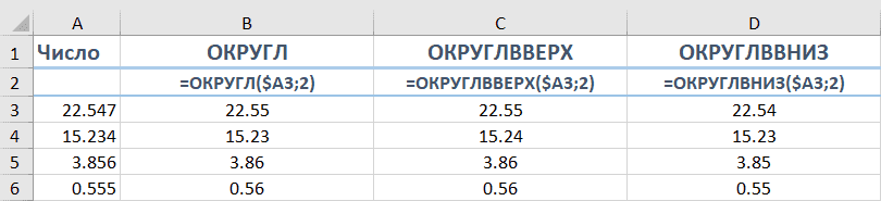 =ROUND(A3, 2) — изменяется по стандартным правилам, в зависимости от того, больше или меньше 5 третий десятичный знак.