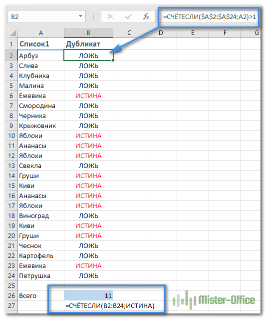 И еще одна формула СЧЁТЕСЛИ(B2:B24,ИСТИНА) сообщит вам, сколько существует дубликатов:
