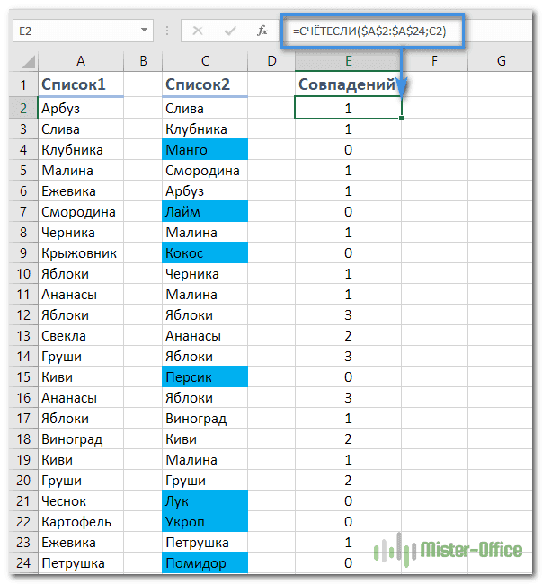 Выражение =СЧЁТЕСЛИ($A$2:$A$24,C2) копируется в столбец E.