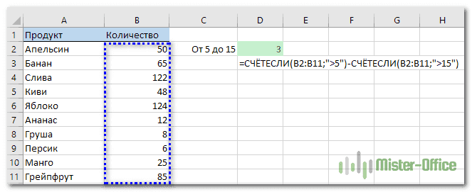 =СЧЁТЕСЛИ(B2:B11;»>5″)-СЧЁТЕСЛИ(B2:B11;»>15″)
