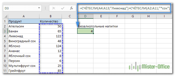 =СЧЁТЕСЛИ(A4:A13;»лимонад»)+СЧЁТЕСЛИ(A2:A11;»*сок»)
