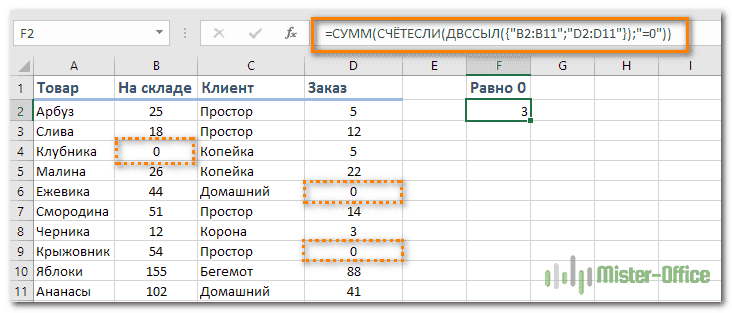 =СУММ(СЧЁТЕСЛИ(ДВССЫЛ({«B2:B11″,»D2:D11″}),»=0»))