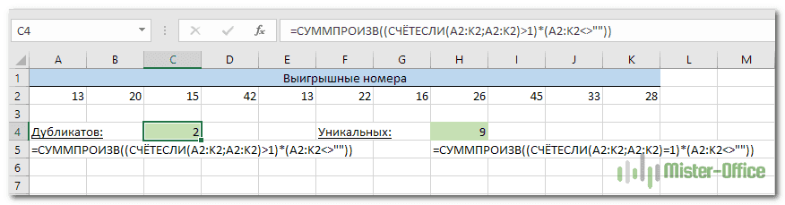 =СУММПРОИЗВ((СЧЁТЕСЛИ(A2:K2,A2:K2)>1)*(A2:K2″»))
